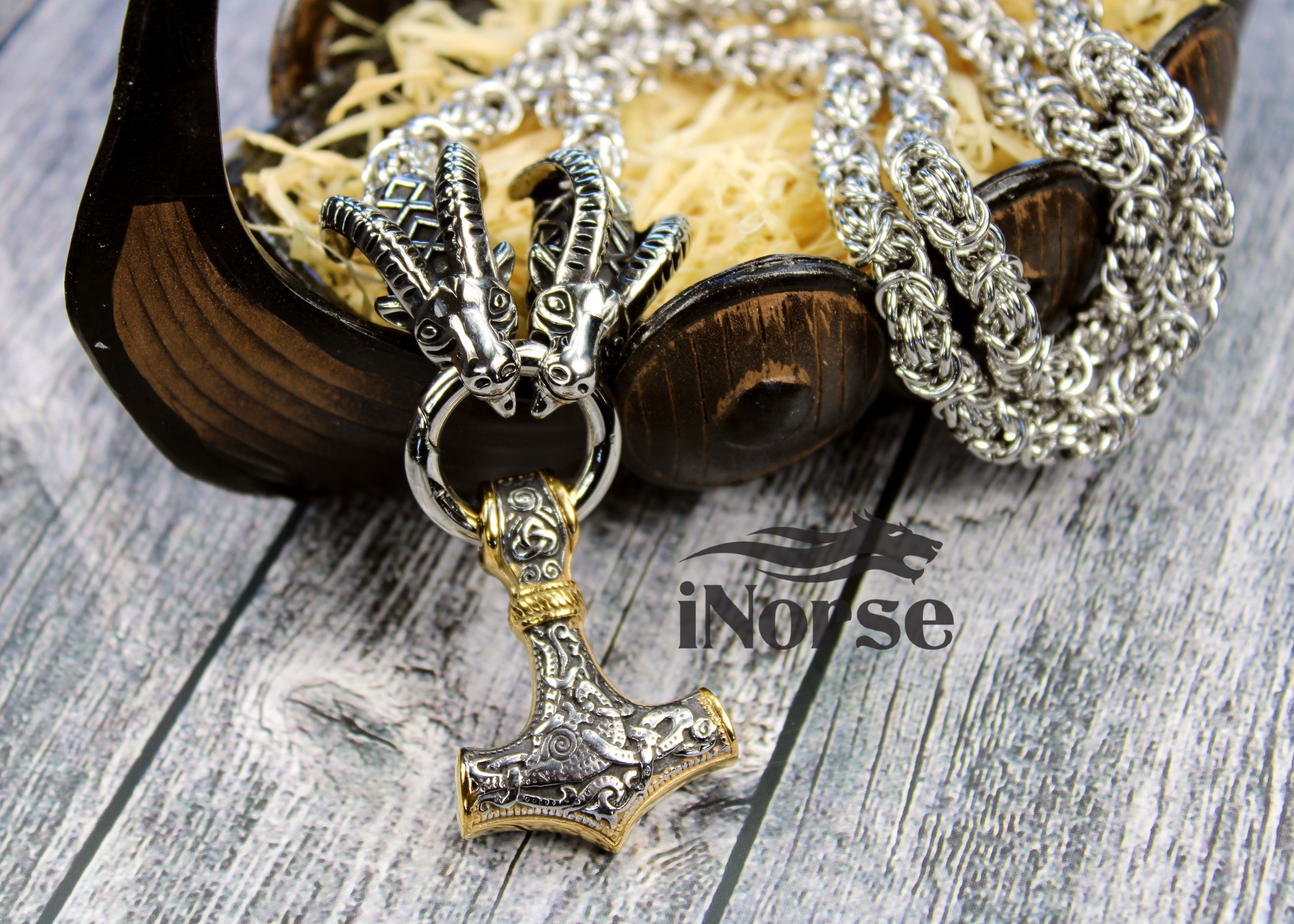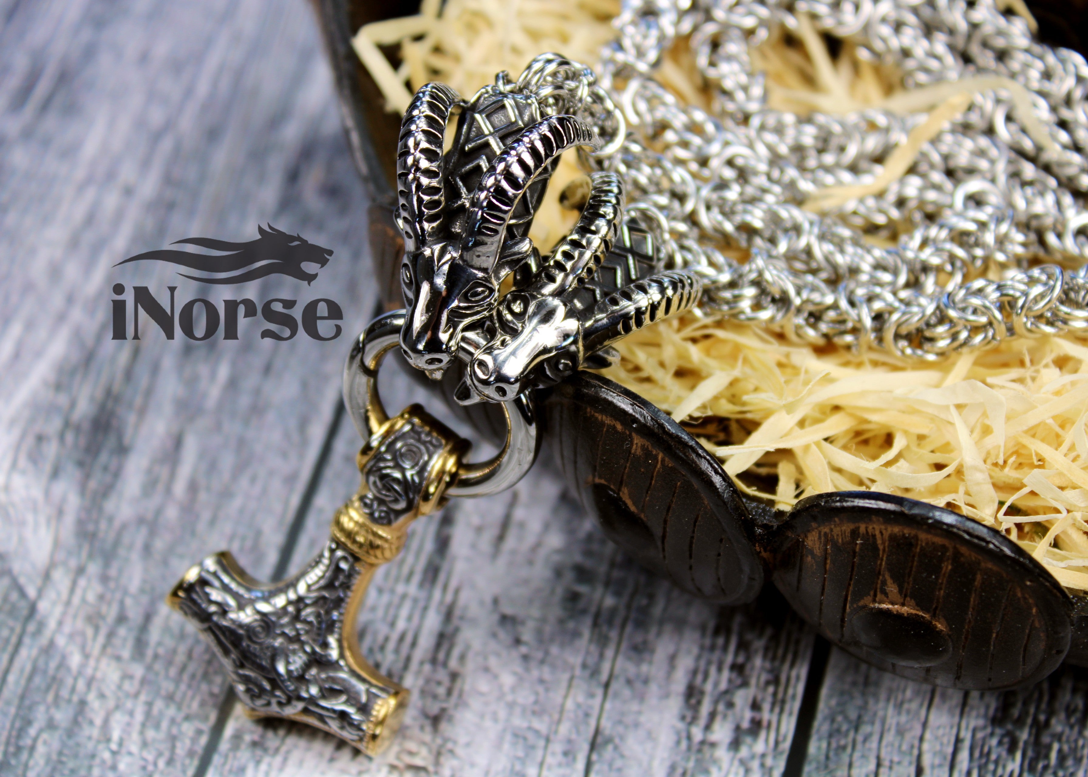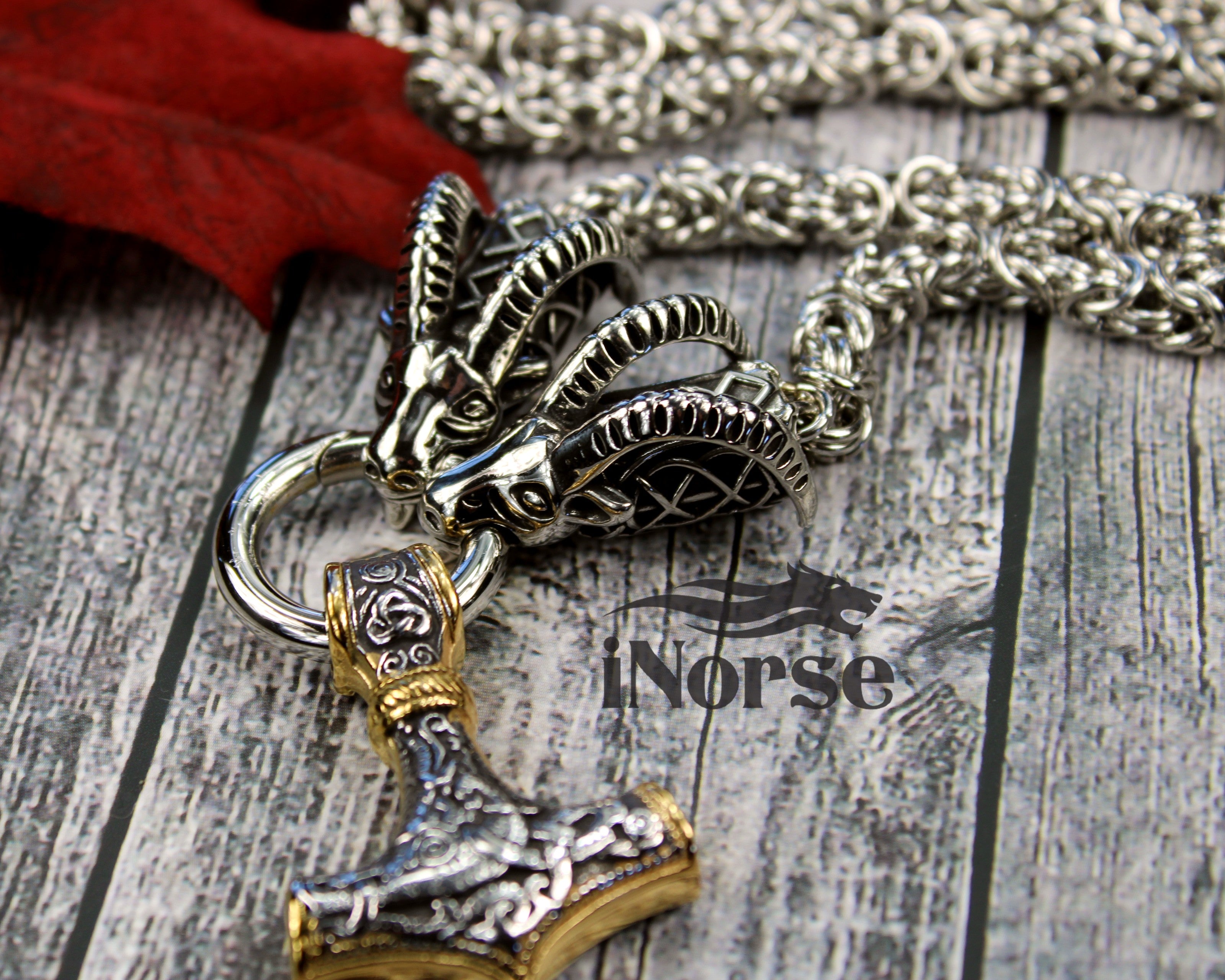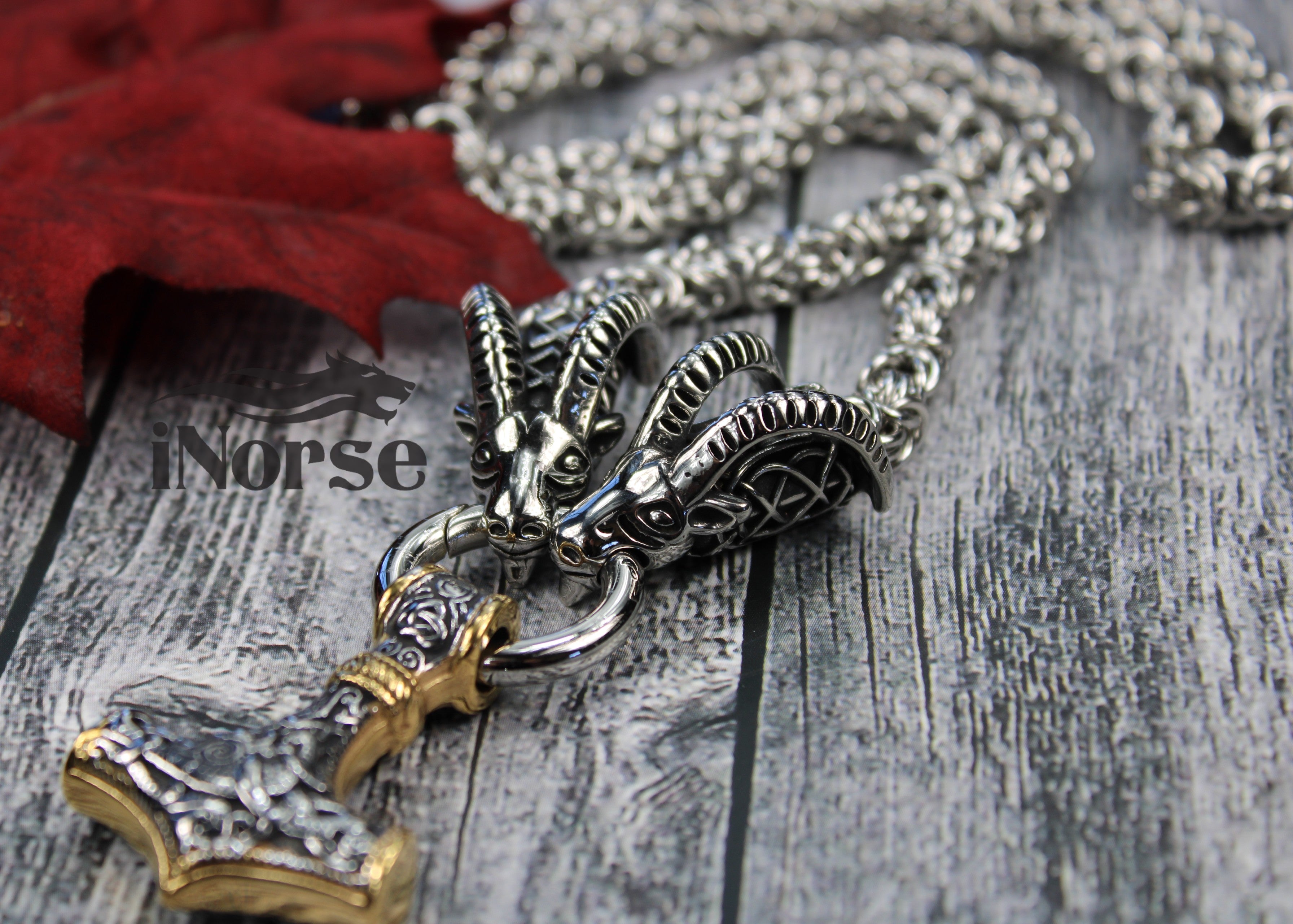This handmade Viking necklace is made of stainless steel and depicts two goat heads clutching the Norse hammer. This necklace is an ode to the Viking thunder god Thor and his two goats, Tanngrisnir and Tanngnjóstr.